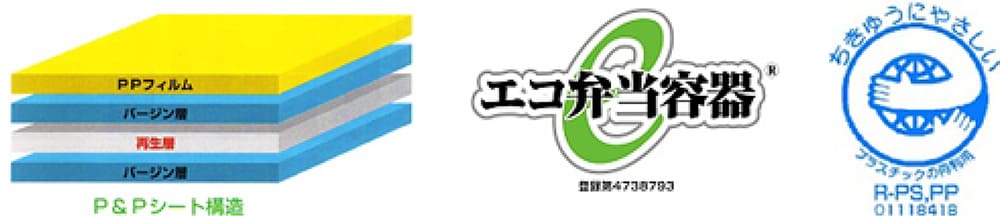 - この製品は、再生原料を40%以上利用しています。再生部分(容器本体)は200°C以上の熱で溶かし再加工したもので、両面をバージン層でサンドイッチし、更にその上にフィルムを装着した4重構造に成形したものです。安全性も(財)日本分析食品センターで確認されています。
