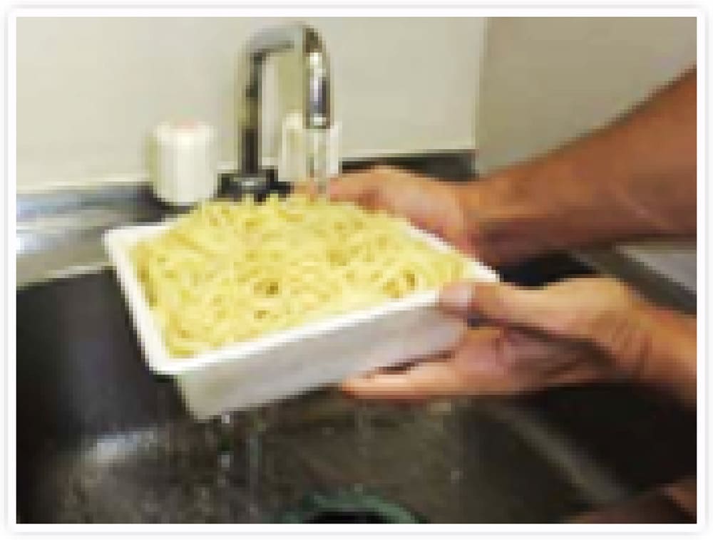 宅配中に固まった麺を中皿ごと流水にさらして、簡単に麺をほぐせます。